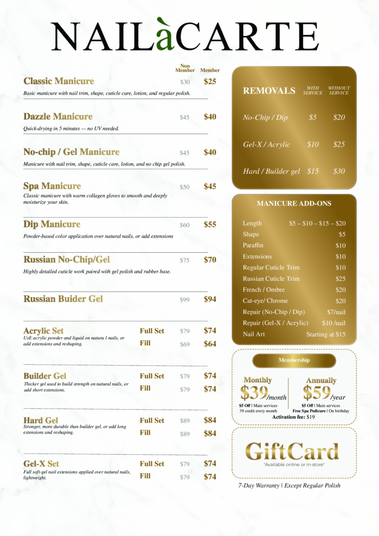 Welcome to NailàCarte, the premier nail salon in Chicago and the best place to receive professional manicures, pedicures, and nail art services. We have a team of dedicated, professional nail technicians who deliver personalized, accessible nail care. Whether you want a no-chip manicure, powder dip nails, professional nail art, or a great pedicure, NailàCarte suits your unique needs.